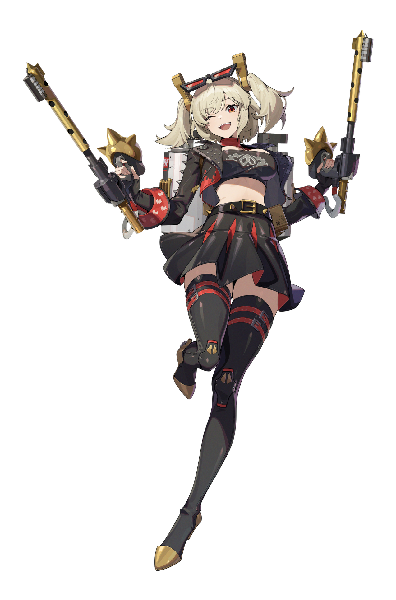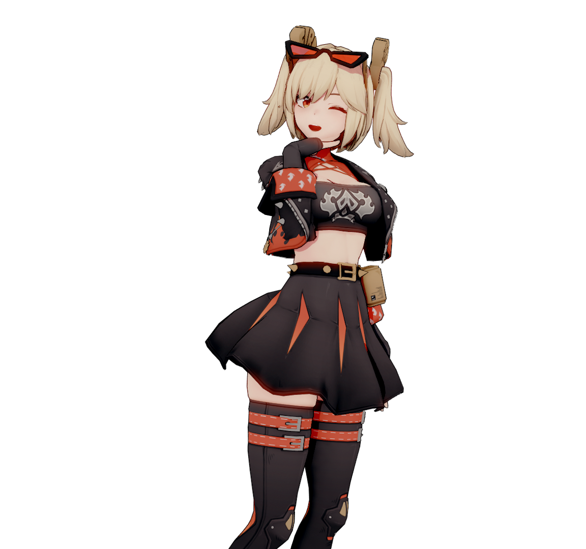 A fiery girl with an addiction to flames hot to the touch. Burnice White is the resident Fuel Expert of the notorious Biker Gang ‘The Sons of Calydon’. Burnice loves everything about fire, starting them, watching them, perfecting them… To her, arson is an art and she’s the artist. Despite coming off like an airhead, Burnice is a born and bred prodigy when it comes to the chemical compound of fuel, creating her own formulas to improve efficiency let alone to power her flamethrowers. She’s a bartender, creating and serving drinks from her own popup bar wherever the Sons of Calydon stop. In short… she’s living her best life.Burnice is relatively upbeat, peppy and has enough energy to make a race car blush. She’s extremely hard to anger, oblivious to most insults and social cues. She just says what she says and assumes everyone is her friend regardless of who they are.As Burnice, Dyna inherits all of Burnice’s personality traits. In her body Dyna is a force to be reckoned with. She’s goes from that bold calculating Trickster who plays the fool to lower people’s defenses to just… actually leaning into Burnice’s stupidity and embracing it all as her own. Choosing not to think too hard and just have fun while enjoying herself. But push come to shove, she can perfectly act as herself.Dyna chose to possess her due to needing a rebound vessel. Her mentality has been all over the place. She’s been unsure of the person she wanted and needed to be. Returning to Burnice gave Dyna a breather. It gives her the chance to just have fun and not think too hard about all that’s weighing her down. After all, why wouldn’t she want to have fun as one of her favourite vessels? While in her body, all Dyna’s worries just melt away. The only thing she’s sure of? If there's not a can of Nitro Fuel in her hand, she's living life wrong!Bottles up Twilight Trickster, time to serve some drinks!